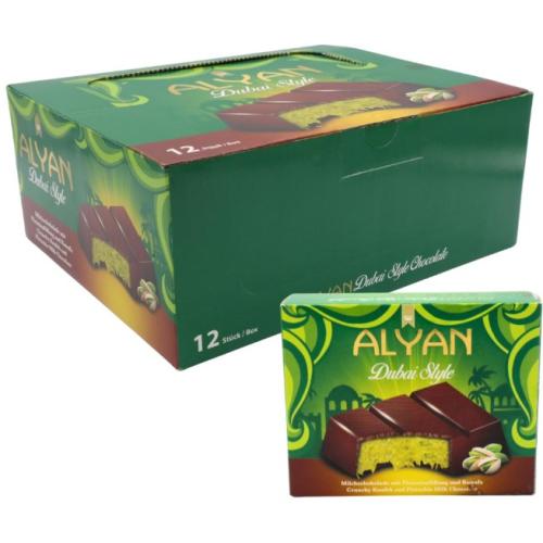 Harness the star power of the Dubai chocolate trend and add Alyan Dubai Style Chocolate to your shelves today. The centre of the bar combines pistachio with finely shredded pastry before encasing it all in a morish, smooth milk chocolate layer. It’s no surprise that this indulgent Dubai chocolate is on the lips of chocolate lovers of all ages! Add the trending chocolate and pistachio bars to your arsenal and capitalise on consumer excitement. Each bulk case of the wholesale Dubai chocolate UK consumers are going crazy over serves 12 bars, and offers you stock that will definitely draw attention in store. Keep on top of the trend and stock the latest global favourite, bulk buy Dubai chocolate and add it to your range today.
