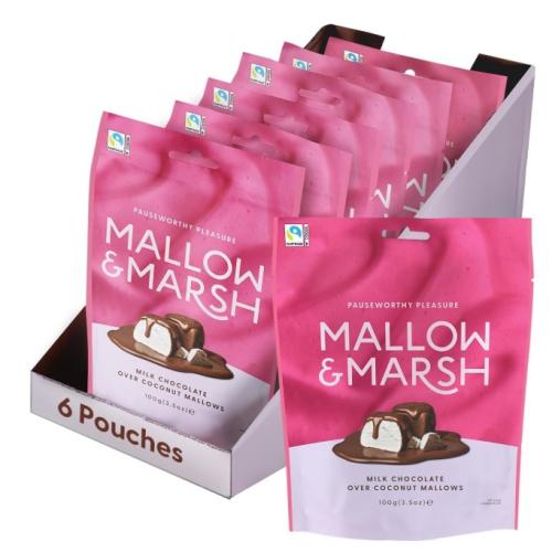 Mallow & Marsh Coconut in Milk Chocolate is a premium, 100g pouch of soft tropical coconut-flavored marshmallows coated in smooth Belgian Fairtrade milk chocolate. Whisked in the UK, these indulgent treats are palm oil-free, with no artificial colours or flavourings, offering a light, fluffy texture with a rich, sweet, and coconutty taste.