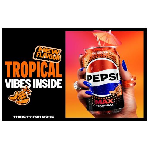 Pepsi Max Tropical (24 x 330ml) is a sugar-free, low-calorie carbonated cola blending classic Pepsi Max taste with mango, passion fruit, and pineapple flavors. Launched in 2026, it features a bold, fruity profile tailored for, and is suitable for vegans and vegetarians