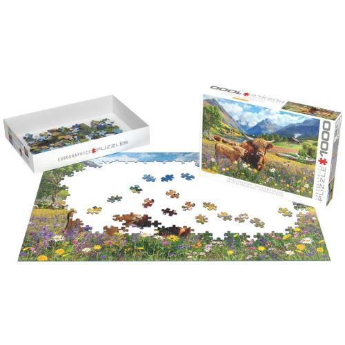 Bring a breath of the Scottish Highlands to your table. This richly detailed scene by Leann Kate features a shaggy Highland cow and her curious calf standing amid a riot of wildflowers. In the distance, a mirror-calm lake reflects snow-tipped mountains, a cozy wooden cottage puffs chimney smoke, and more cattle graze along sunlit meadows.