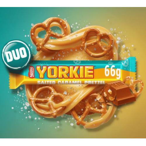 The Nestlé Yorkie Salted Caramel Pretzel Duo (66g) is a limited-edition, chunky milk chocolate bar featuring salted caramel flavouring and crunchy pretzel pieces. Designed for a "no-nonsense" snack, this Duo format offers two thick bars of solid chocolate, blending sweet, salty, and crunchy textures.